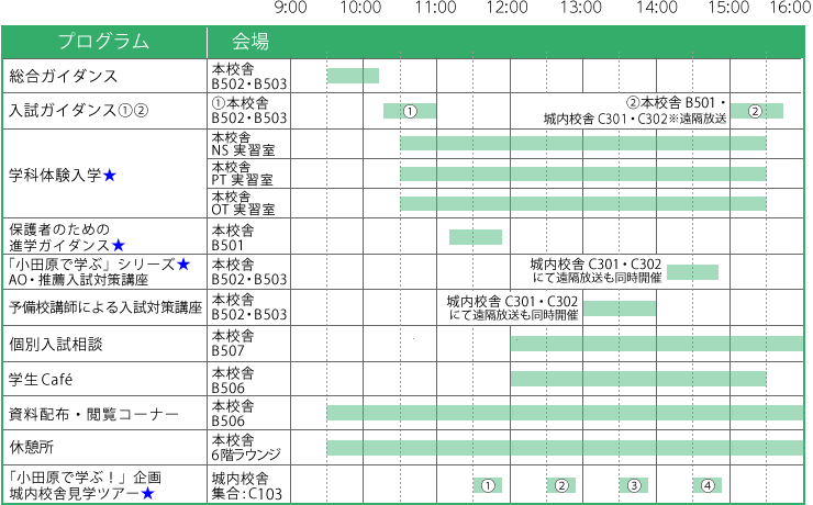 ![]() 総合ガイダンス(45分) ●9:30~10:15 会場:【本校舎】B502・B503 国際医療福祉大学の概要説明や、オープンキャンパスの見どころなどをわかりやすくご紹介! ※挨拶・小田原保健医療学部紹介 ※オリエンテーション |