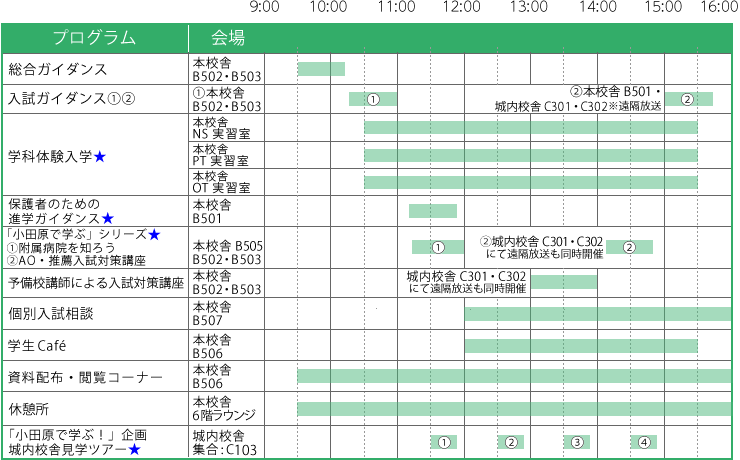![]() 総合ガイダンス(45分) ●9:30~10:15 会場:【本校舎】B502・B503 国際医療福祉大学の概要説明や、オープンキャンパスの見どころなどをわかりやすくご紹介! ※挨拶・小田原保健医療学部紹介 ※オリエンテーション |