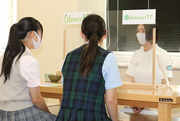 ![]() 個別相談の際はマスク着用のうえアクリルボードを使用します。また終了後は都度消毒をしています |