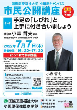 2022年度 小田原キャンパス・市民公開講座の 講演会企画として、小田原保健医療学部 学部長の小森 哲夫 先生による「オンライン特別講演会」を開催します。多くの皆様のご参加をお待ちしております。