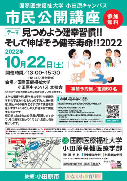 2022年度 小田原キャンパス・市民公開講座として、小田原保健医療学部 看護学科、理学療法学科、作業療法学科の学生が中心となり、手洗い、身体測定、頭と体の体操などさまざまな講座を開催します。感染拡大防止のため、40分ごとの入れ替え制で実施する予定です。 皆様のご参加をお待ちしております。