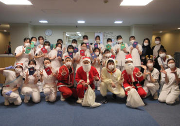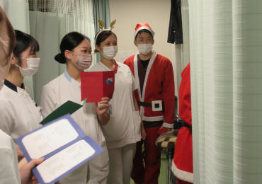 本学を卒業した先輩看護師誘導のもと、ユニフォームを着用した学生達がクリスマスの歌を歌いながら各病室でキャンドルサービスを行い、サンタクロース役がお一人おひとりにお声掛けをしながらプレゼントをお渡ししました。