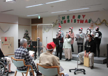 その後、クリスマス仕様に彩られた会場で軽音部学生によるコンサートや佐藤哲夫名誉病院長と職員によるピアノ演奏・合唱が行われ、例年を上回る28名の患者様に足をお運び頂きました。