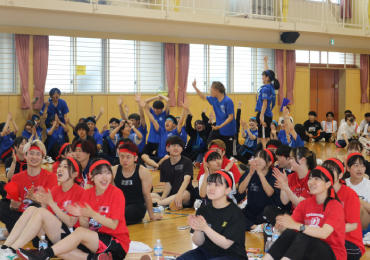 学年、学科の異なる約190名の学生が6つの色にチーム分けされ団長を中心にチームごとに、お揃いのTシャツやビブスをまとって盛り上がりました。
